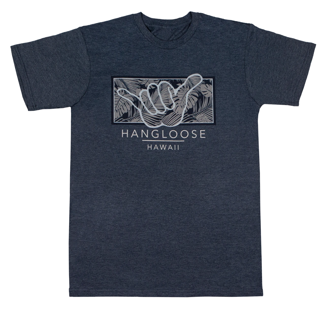 The iconic “Shaka,” known throughout the Hawaiian islands as a casual and friendly greeting, laid over a monstera and fern leaf background.