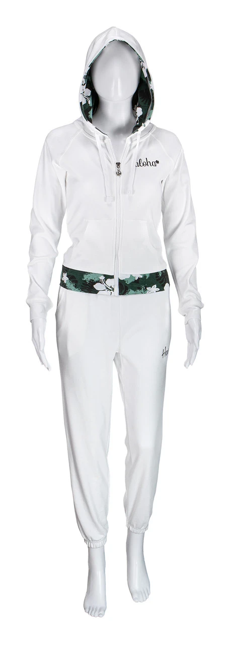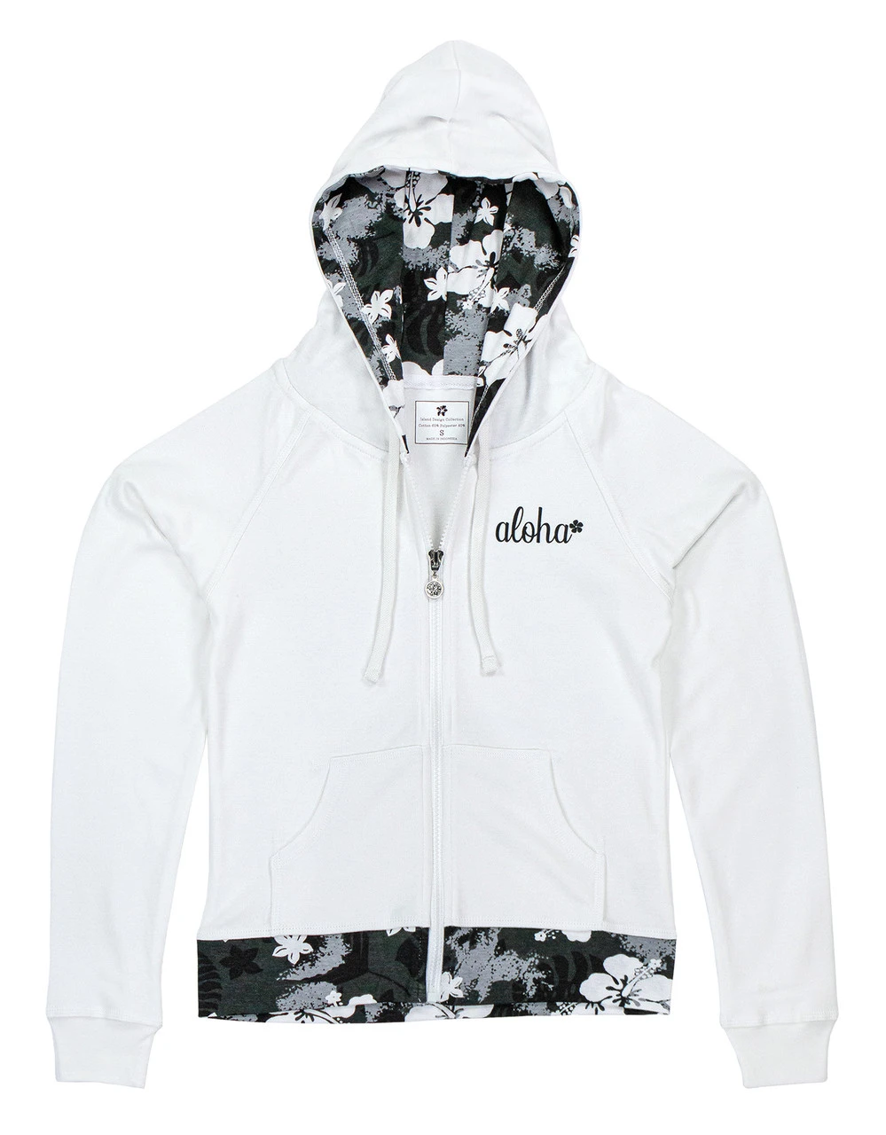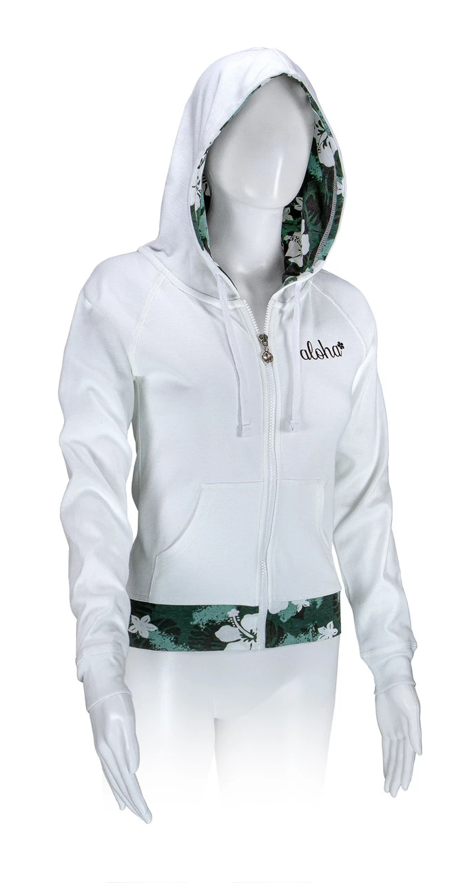 Zip up sweatshirt with drawstring hood which is lined in a Hawaiian print. This hoodie also has a front kangaroo pocket along with a printed band at the waist that is form fitting for flattery and contoured to accentuate!