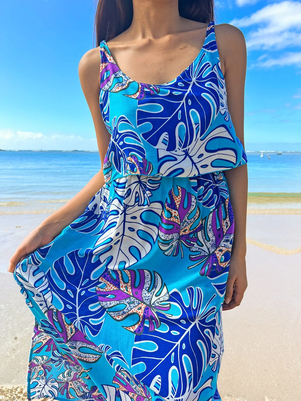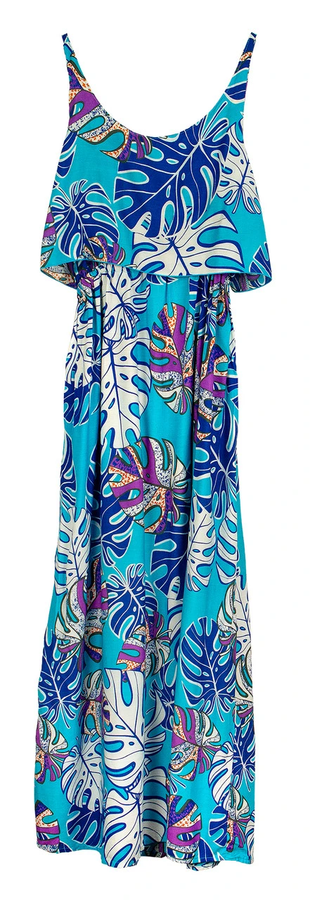 Napua Collection Ruffle Maxi Dress – Abstract Monstera: Blue