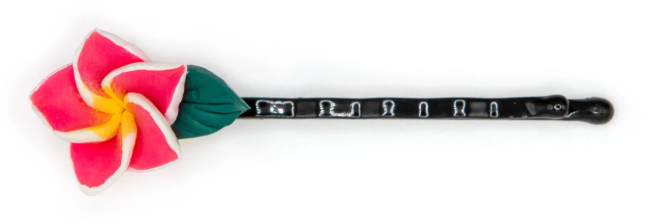 Pretty plumeria blossoms measure approximately 0.625″ in diameter – on a durable black bobby pin. Set of Two.