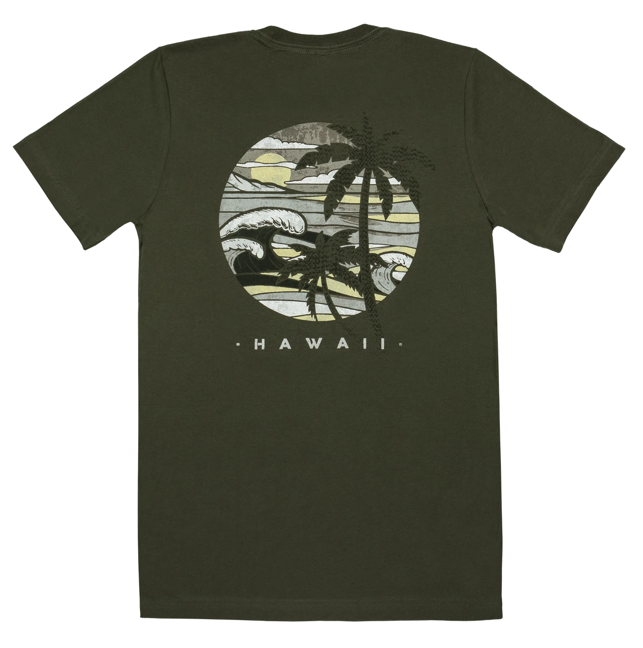 Stylized shorebreak background with idyllic palm tree silhouettes.